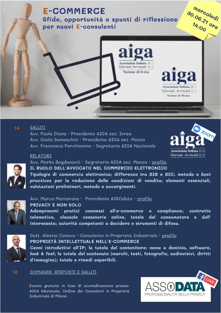 Il seminario, organizzato da AIGA sez. Monza: Associazione Monzese Giovani Avvocati e AIGA sez. Ivrea: Associazione Italiana Giovani Avvocati di Ivrea si terrà tramite la piattaforma ZOOM il 30 giugno 2021 dalle ore 14:00 alle ore 18:00 circa.