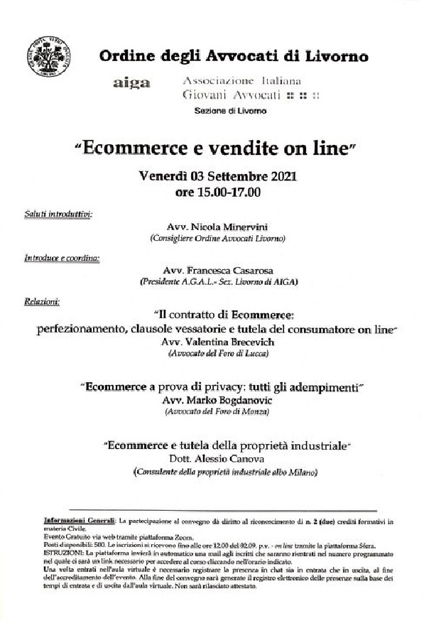 Il seminario, organizzato da AIGA sez. LIVORNO si terrà tramite la piattaforma ZOOM il 3 SETTEMBRE 2021 dalle ore 15:00 alle ore 17:00 circa.